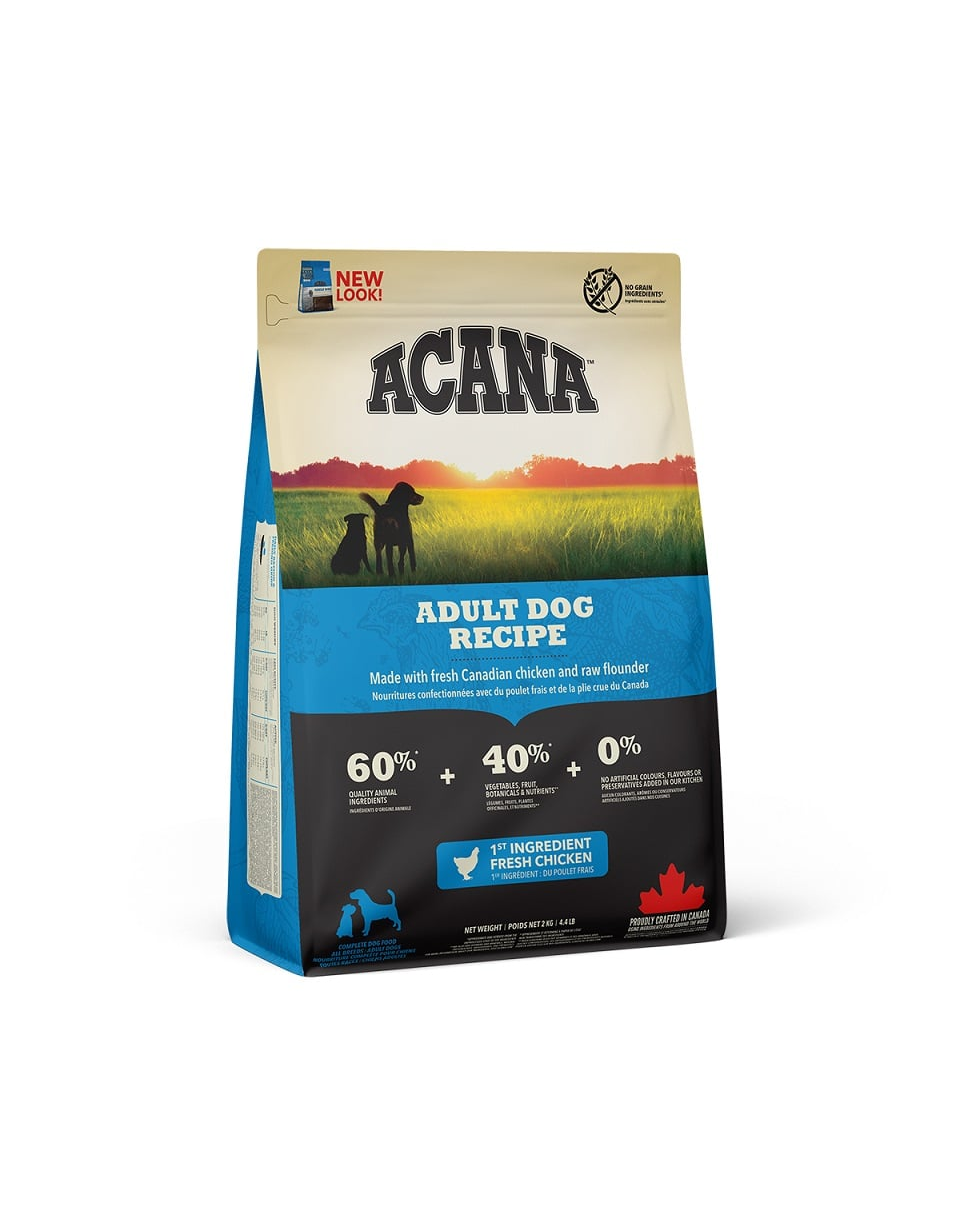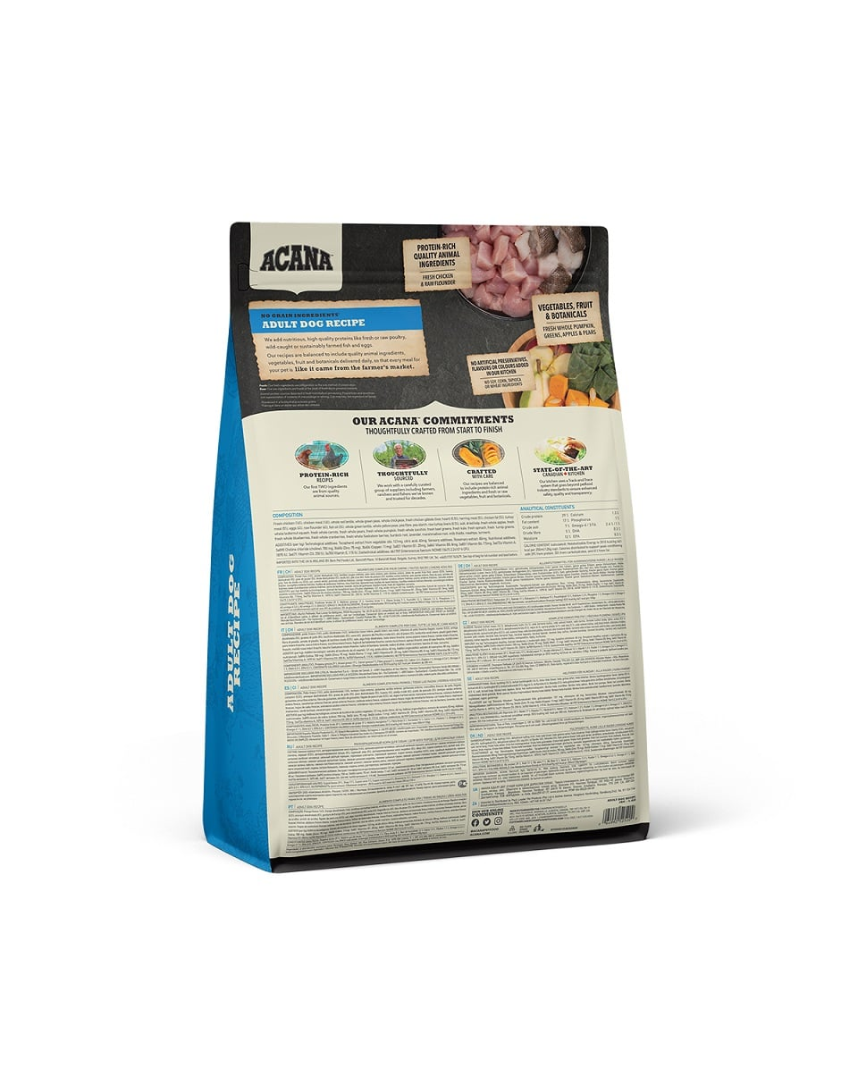 Energie metabolică: 3510 kcal/kg (421 kcal per ceașcă de 250 ml/120 g), din care 29% provin din proteine, 30% din carbohidrați și 41% din grăsimi. Hrana ACANA ADULT DOG a fost formulată pentru a respecta nivelurile nutriționale stabilite de FEDIAF Dog Food Nutrient Profiles for Adult Maintenance.