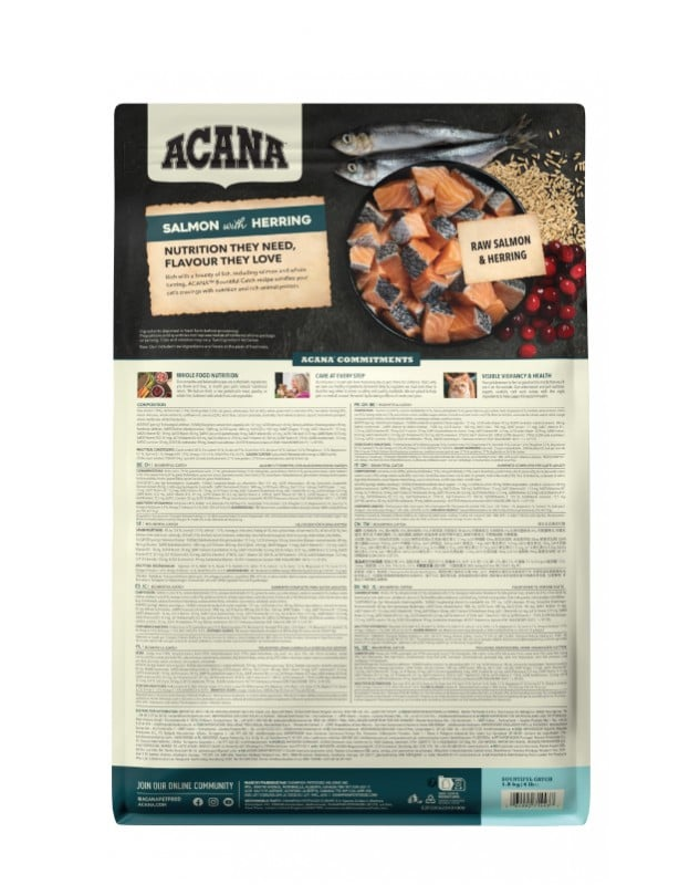 Somon întreg crud (15%), somon deshidratat (15%), hering deshidratat (15%), ovăz întreg, mazăre întreagă, ulei de polac (8%), linte verde întreagă, merluciu întreg crud (4%), hering întreg crud (4%), năut întreg, linte roșie integrală, fibre de linte, păstrăv curcubeu crud (2%), ulei de somon (2%), ulei de floarea-soarelui, alge uscate, dovleac muscat integral proaspăt, dovleac integral proaspăt, afine integrale proaspete, afine integrale proaspete, afine integrale proaspete.