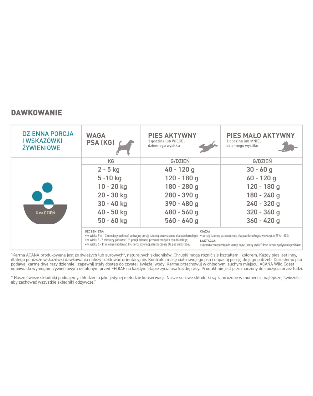 Porțiile prezentate în tabel sunt aproximative. Întotdeauna ajustați cantitatea de hrană pentru a se potrivi câinelui dumneavoastră în mod individual, ținând cont de starea sa, de sănătate, de apetit și de predispoziția la creșterea în greutate.