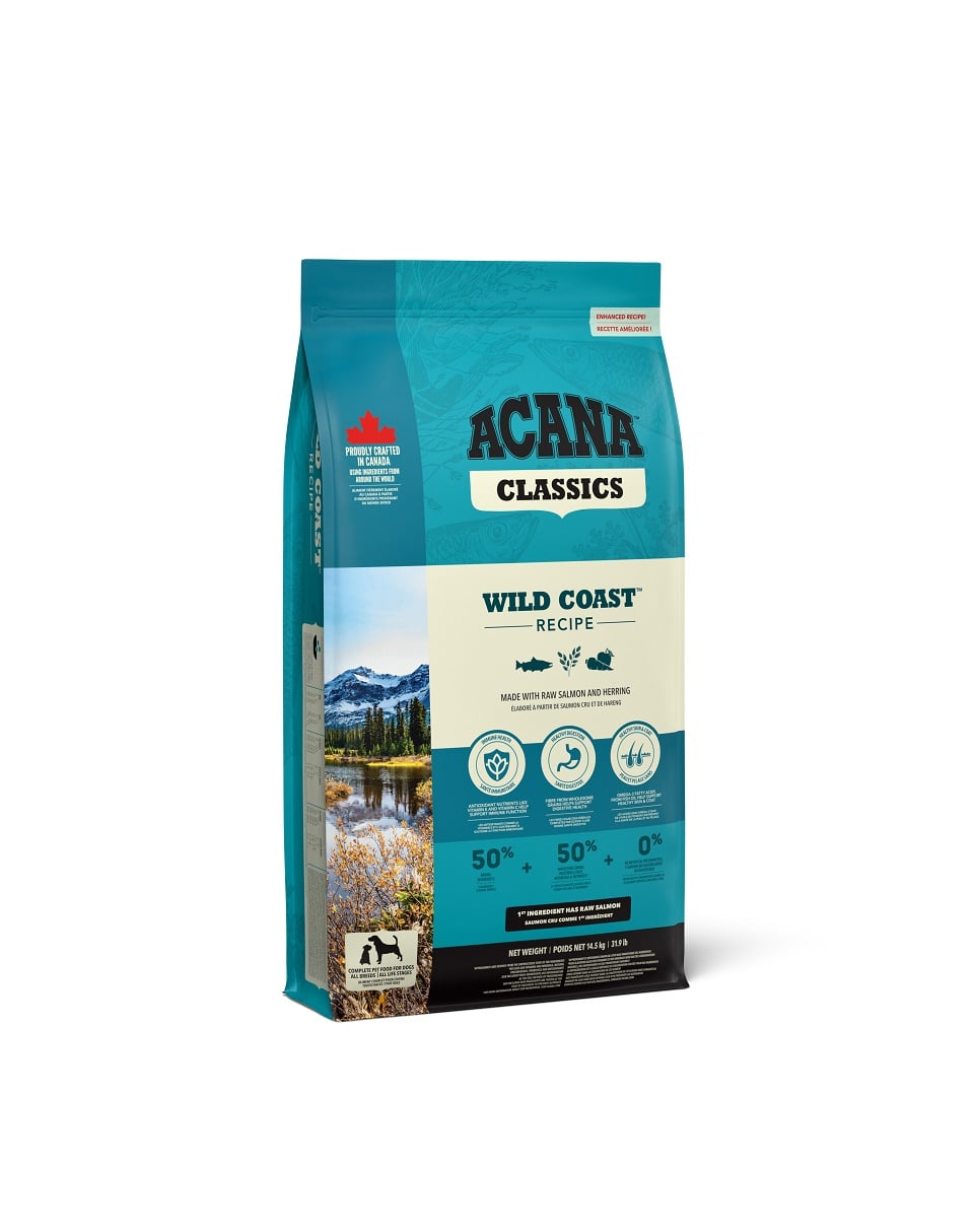 Acana Wild coast oferă proteine de înaltă calitate de origine animală, care sunt absorbite cel mai bine de câini. Adăugarea de fructe, legume și ierburi în hrană îmbunătățește palatabilitatea și aroma acesteia. Merele, perele și dovleacul furnizează vitamine și antioxidanți naturali pentru a susține sistemul imunitar.