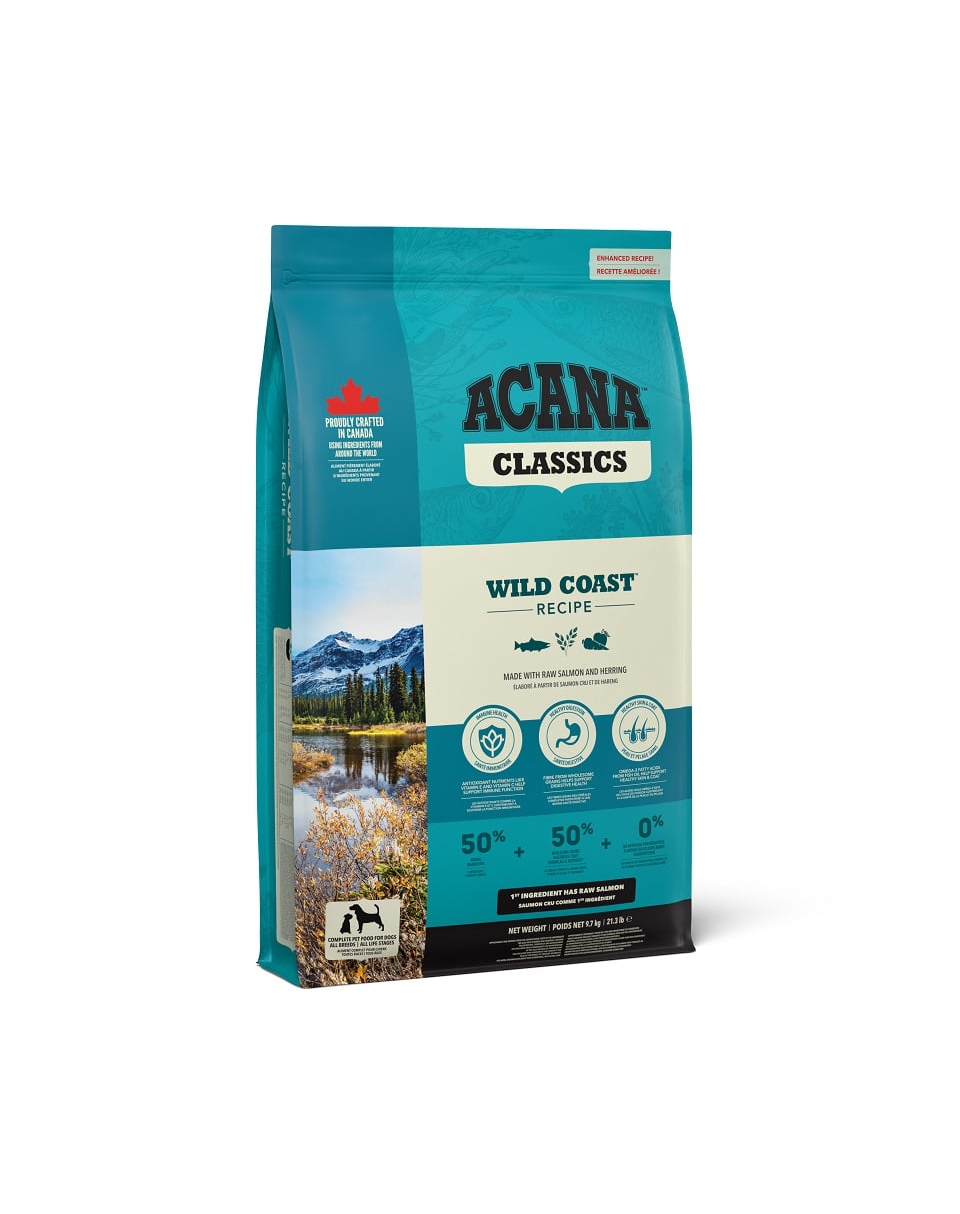 Acana Wild coast oferă proteine de înaltă calitate de origine animală, care sunt absorbite cel mai bine de câini. Adăugarea de fructe, legume și ierburi în hrană îmbunătățește palatabilitatea și aroma acesteia. Merele, perele și dovleacul furnizează vitamine și antioxidanți naturali pentru a susține sistemul imunitar.