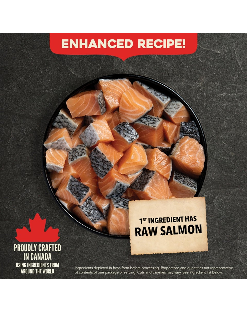 Somon crud (22%), hering deshidratat (19%), orz perlat, mazăre integrală, ovăz fără coajă, grăsime de porc (8%), ovăz integral, fibre de năut, ulei de pește (1%), carbonat de calciu, clorură de potasiu, alge uscate, sare, rădăcină de cicoare uscată, dovleac întreg proaspăt, dovleac muscat întreg proaspăt, morcov întreg proaspăt, mere întregi proaspete, pere întregi proaspete, dovlecei întregi proaspeți, varză kale proaspătă, spanac proaspăt, frunze proaspete de napi, frunze proaspete de sfeclă roșie, afine întregi, afine întregi, saskatoons întregi, turmeric, ciulin, rădăcină de brusture, lavandă, rădăcină de valeriană, măceșe
