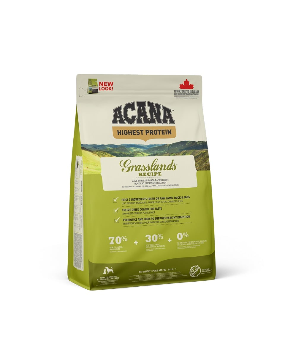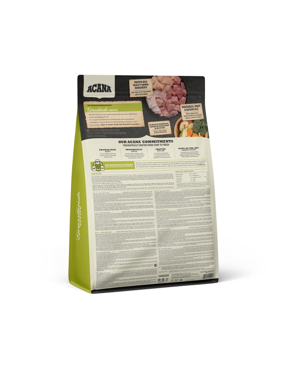 Hrana uscată completă ACANA GRASSLANDS este preparată din carne de miel, carne de rață, ouă întregi și pește prins în mediul natural. Aceste ingrediente sunt furnizate bucătăriei Champion zilnic proaspete, pline de valoare nutritivă. Conținutul ridicat de proteine și cantitatea redusă de carbohidrați se potrivesc perfect dietei naturale a câinilor. Formula complet curată a ACANA GRASSLANDS este plină de fructe, legume și ierburi sănătoase, bogate în oligoelemente și antioxidanți.