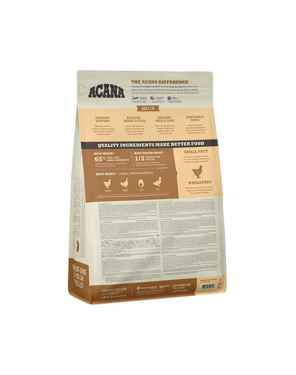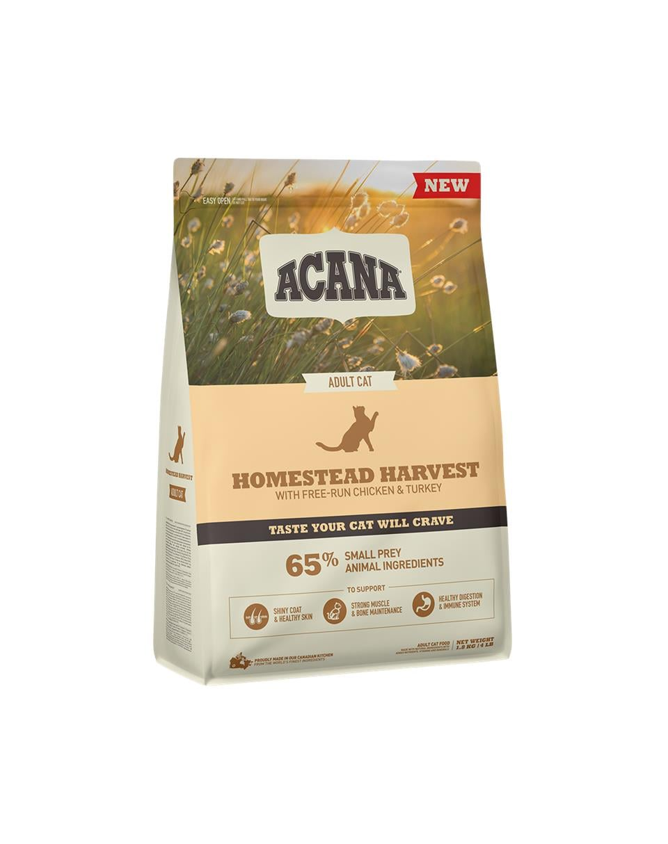 Acana Homestead Harvest este bogată în carne de pui, curcan și rață în proporții WholePrey. Pe lângă carnea de pasăre, conține și organe și cartilaje care hrănesc în mod natural pisica dumneavoastră.