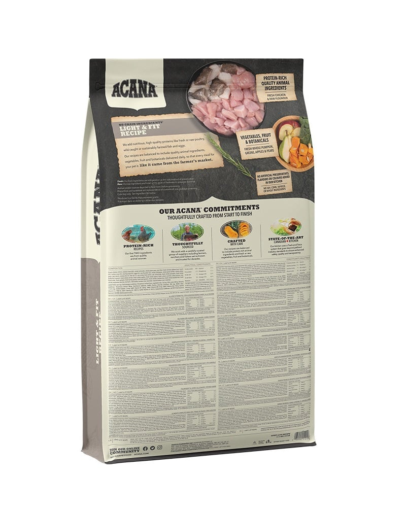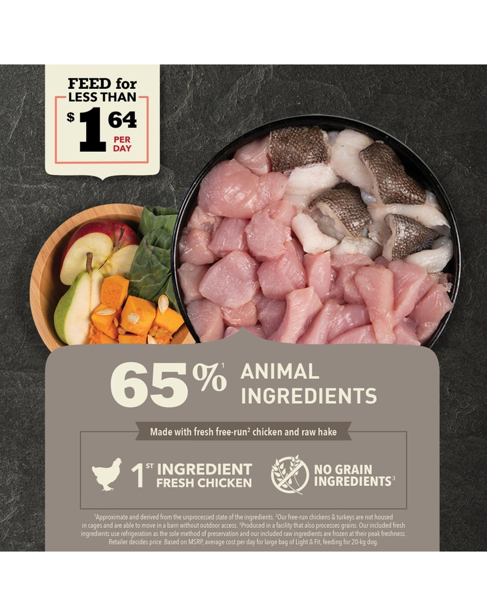 Carne proaspătă de pui (20,5%), pui deshidratat (20%), linte roșie integrală, mazăre verde integrală, fibre de mazăre, organe proaspete de pui (ficat, inimă) (5%), curcan deshidratat (5%), hering deshidratat (4%), ouă (4%), cambulă crudă (4%), năut întreg, linte verde întreagă, mazăre galbenă întreagă, amidon de mazăre, grăsime de pui (1%), ulei de pește (1%), ficat crud de curcan (0,5%), sare, alge uscate. dovleac întreg proaspăt, dovleac muscat întreg proaspăt, morcovi întregi proaspeți, mere întregi proaspete, pere întregi proaspete, dovlecei întregi proaspeți, rădăcină de cicoare uscată, varză kale proaspătă, spanac proaspăt, frunze proaspete de napi, frunze proaspete de sfeclă roșie, afine întregi proaspete, afine întregi proaspete, fructe de saskatoon întregi proaspete, turmeric, ciulin sfânt, rădăcină de brusture, lavandă, rădăcină de valeriană, măceșe.
