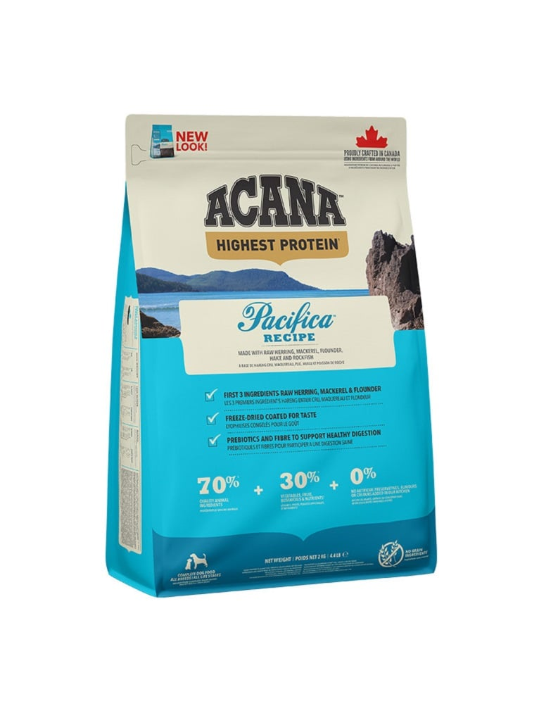 Rețeta constă în 70% pește natural din apele canadiene din Pacificul de Nord. Sunt folosiți, printre alți pești, sardinele, heringul, cambula, codul alb, merluciul și uleiul de somon. Acestea fac hrana să fie bogată în proteine ușor digerabile și să abunde în grăsimi sănătoase și acizi grași nesaturați Omega-3 și -6. Nivelurile scăzute de carbohidrați împiedică creșterile de zahăr din sânge, reducând astfel riscul de diabet și apetitul excesiv la câini. Un nivel ridicat de proteine valoroase oferă un sentiment de sațietate mai rapid și mai îndelungat. Peștele este o sursă importantă de grăsimi sănătoase, proteine și acizi grași nesaturați care întăresc inima, creierul, îmbunătățesc starea pielii și a blănii. Adaosul de fructe, legume și ierburi îi îmbunătățește gustul și aroma. Merele, perele și dovleacul oferă vitamine și antioxidanți naturali, susținând astfel sistemul imunitar.