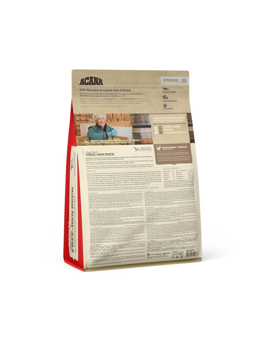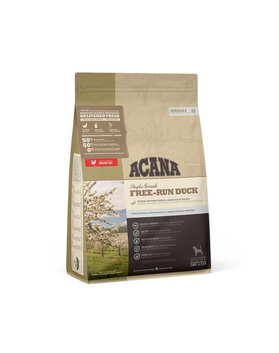 Hrana Acana Singles Free-Run Duck conține un tip de proteine derivate din carne de rață, care este o sursă de proteine animale ușor digerabile. Este perfect pentru câinii sensibili. Rața prezentă în mâncare este crescută în aer liber în zonele rurale din Ontario. Acesta este furnizat bucătăriilor NorthStar® într-un raport nutritiv WholePrey™ de carne, ficat și pipiță, reflectând dieta naturală a câinelui dumneavoastră. Perele proaspete, dovleacul și dovleacul sprijină sănătatea digestivă.