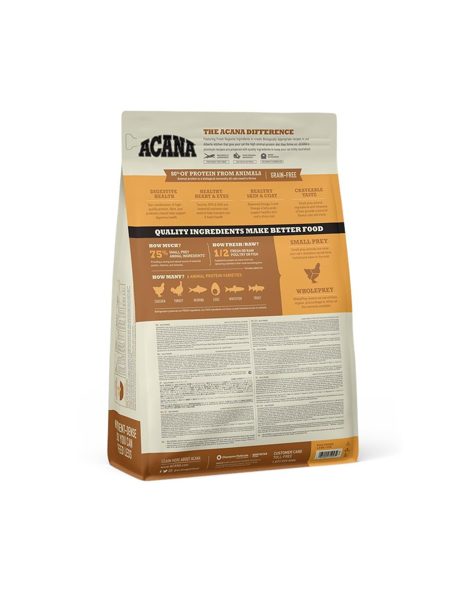 Formulă fără cereale, cu un conținut ridicat de carne proaspătă de pui, curcan și pește regional - hering și păstrăv. Alimentul se distinge prin procesul de producție, în care carnea folosită nu a fost niciodată congelată și nu conține conservanți. Toate alimentele Acana încearcă să reproducă dieta naturală a pisicilor strămoșești și se bazează pe cunoștințele actuale privind preferințele carnivorelor. Acestea se bazează pe un amestec de diferite surse de proteine animale, la care se adaugă legume și fructe, ierburi aromatice și o legătură de carbohidrați - linte, năut. Ca urmare, furajele conțin o cantitate limitată de carbohidrați - aproximativ 25% - care este cea mai mică posibilă în producția de hrană uscată. Acestea nu irită stomacul pisicilor și nu perturbă procesul digestiv. Indicele glicemic scăzut reduce riscul de obezitate și nu provoacă vârfuri de zahăr în sânge. Peștele este o sursă bogată de proteine animale, care se digeră ușor și bine. Acestea conțin niveluri ridicate de acizi grași nesaturați Omega-3 și -6, care sunt esențiali pentru buna funcționare a organismului, pentru întărirea inimii, a creierului și pentru a avea grijă de aspectul sănătos al pielii și al blănii. Carnea de pui și de curcan este ușor de digerat și fragedă, în plus, are un profil bun de aminoacizi.