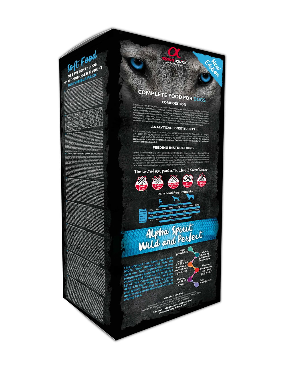 85% pește proaspăt (sardinella spaniolă (Sardinella aurita), macrou (Scomber scombrus), macrou) (Trachurus spp.), Sardină europeană (Sardina pilchardus)), amidon hidrolizat, cartilaj hidrolizat, glicerină naturală, ouă, pulpă de sfeclă, drojdie (Saccharomyces cerevisiae), dovleac, pere, ananas, cimbru (Thymus vulgaris), coriandru (Coriandrum sativum), chimen (Cuminum cyminum), turmeric (Curcuma longa)