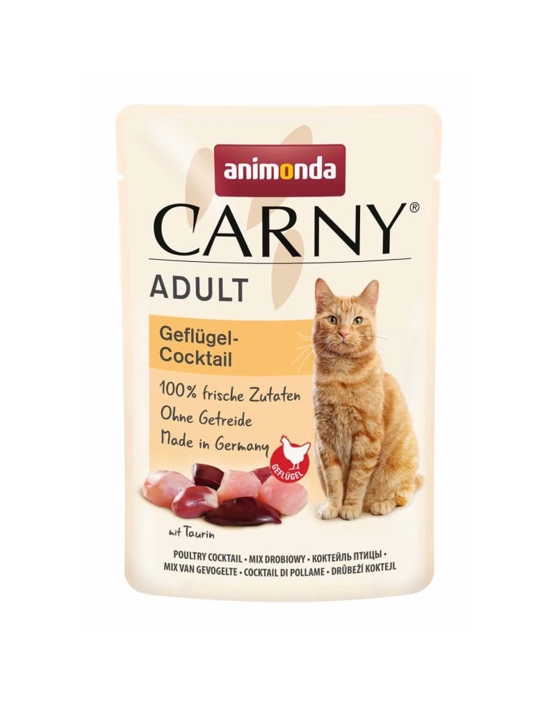 ANIMONDA Carny Adult Pouch Poultry Cocktail este o hrană completă pentru pisici, preparată din ingrediente proaspete din carne, care oferă un gust natural și o nutriție echilibrată. Combinația atent aleasă de carne de pasăre face hrana foarte gustoasă și bine acceptată de pisici.