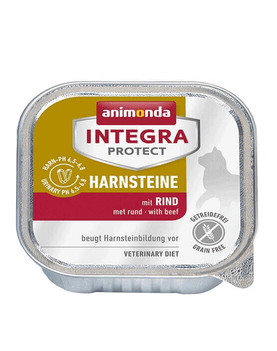 Animonda Integra Protect Urinary cu Vită este o hrană umedă medicinală pentru pisici care suferă de boli ale tractului urinar. Producătorul oferă mai multe soiuri de hrană de dietă, pentru a se asigura că pisicile bolnave au o varietate de senzații gustative și olfactive. Aici, palatabilitatea unei mese este combinată cu efectul său de vindecare. Pietrele din vezica urinară sunt legate de modificarea pH-ului urinar. Cauza acestui fenomen sunt adesea infecțiile bacteriene ale tractului urinar și ale vezicii urinare. Bacteriile moarte găsite în vezică sunt substratul pentru cristalizarea sărurilor de calciu, oxalați sau structuri de calciu. Tulburările tractului urinar se pot manifesta, prin faptul că pisica urinează în afara litierii sau prin vocalizare înainte sau după urinare. Dacă observi orice modificare a comportamentului pisicii, se recomandă ca pisica să fie consultată de un veterinar. Apoi, după consultație, trebuie să urmezi instrucțiunile medicului veterinar și să oferi pisicii o dietă care să sprijine organismul în obținerea echilibrului. Animonda Integra Protect Urinary reduce din dietă acidul uric, iar magneziul și calciul îmbunătățesc calitatea urinei și consolidează formarea de substanțe care inhibă cristalizarea și precipitarea sărurilor minerale.Este un aliment nutritiv, gustos și ușor de digerat.