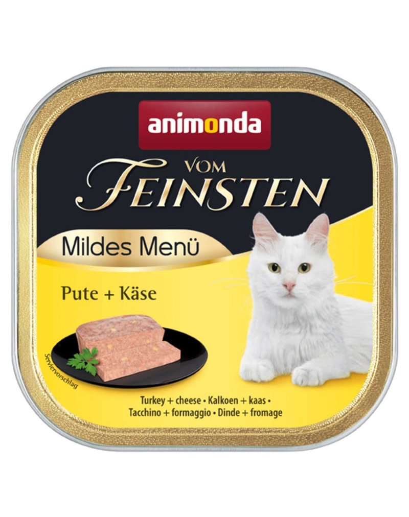 ANIMONDA Vom Feinsten Mild Menu cu curcan și brânză este o hrană completă destinată pisicilor adulte cu vârsta între 1 și 6 ani. Curcanul atent selecționat, ușor digerabil și fără organe sau ficat, oferă o masă delicată și gustoasă, potrivită chiar și pentru pisicile pretențioase. Pateul fin, cu bucăți de carne, asigură toți nutrienții esențiali pentru sănătate și energie zilnică.
