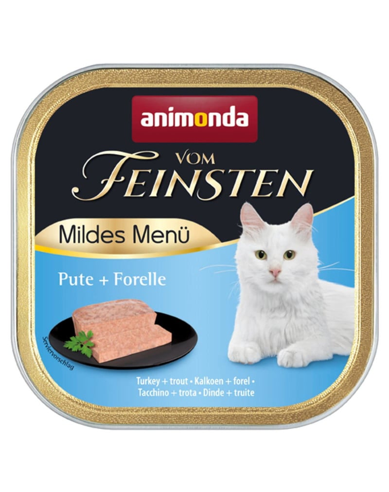 ANIMONDA Vom Feinsten Mild Menu cu curcan și păstrăv este o hrană completă, creată pentru pisici adulte cu vârsta între 1 și 6 ani. Curcanul delicat și ușor digerabil, fără organe și ficat, combinat cu păstrăv aromat, oferă o masă gustoasă și nutritivă. Pateul din carne, cu bucăți generoase, furnizează toți nutrienții esențiali pentru sănătatea și vitalitatea pisicii.