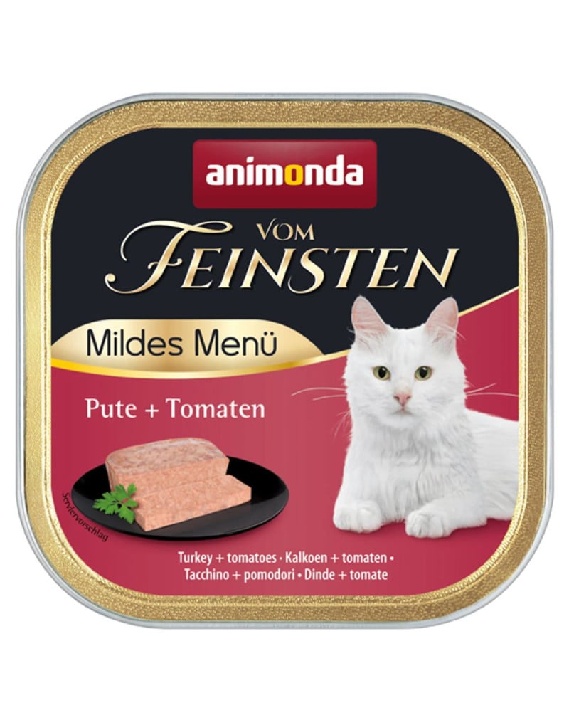 ANIMONDA Vom Feinsten Mild Menu cu curcan și roșii este o hrană completă pentru pisici adulte cu vârsta între 1 și 6 ani. Curcanul delicat, fără organe și ficat, combinat cu roșii suculente, oferă un preparat ușor de digerat, potrivit chiar și pentru pisicile mai pretențioase. Textura de pate cu bucăți de carne asigură un aport nutritiv echilibrat.