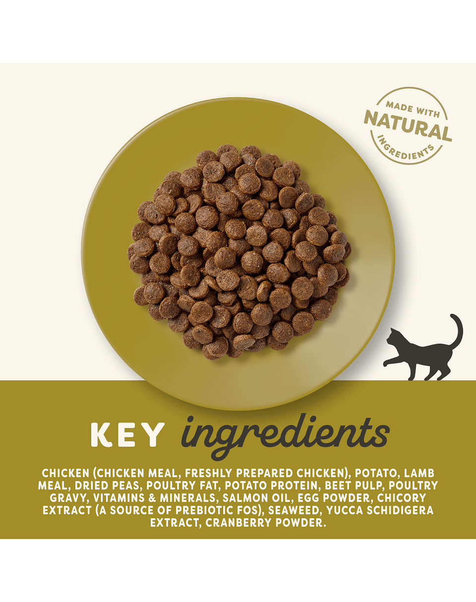 Pui uscat (48%), miel uscat (20%), cartofi uscați, pui tocat dezosat (12%), pulpă de sfeclă de zahăr, sos de pui, ulei de somon, vitamine și minerale, ouă uscate, fibră de celuloză de origine vegetală ( 0,03%), clorură de sodiu, carbonat de calciu, alge marine, merișoare, dl-metionină, clorură de potasiu, extract de iaurt, extract de fructe citrice, extract de rozmarin.