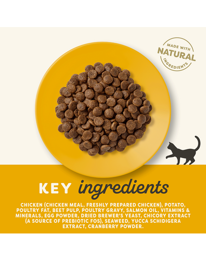 Făină de pui 65%, carne de pasăre proaspăt măcinată 17%, cartofi, drojdie de bere, pulpă de sfeclă, sos de pasăre, ulei de somon (sursă de Omega 3), vitamine și minerale, ou uscat, fibre de celuloză 0,03%, clorură de sodiu, carbonat de calciu, merișor, DL-metionină, clorură de potasiu, extract de yucca, extract de citrice, extract de rozmarin.