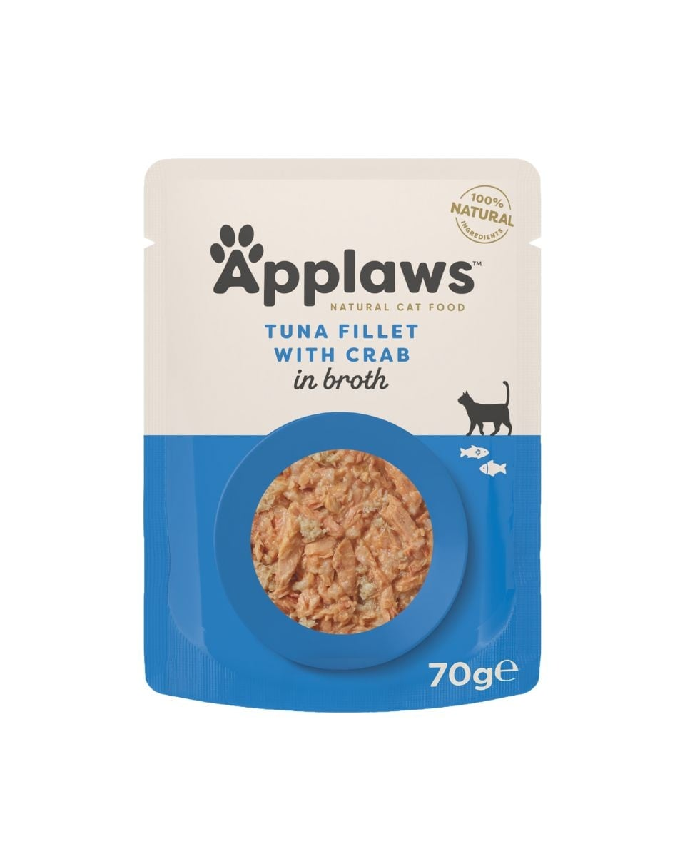 APPLAWS Cat Adult Tuna with Crab in Broth este o hrană umedă complementară, naturală, destinată pisicilor adulte. Rețeta combină filet delicat de ton cu crab aromat, servite într-un bulion ușor de pește, pentru un gust natural și o acceptare foarte bună.