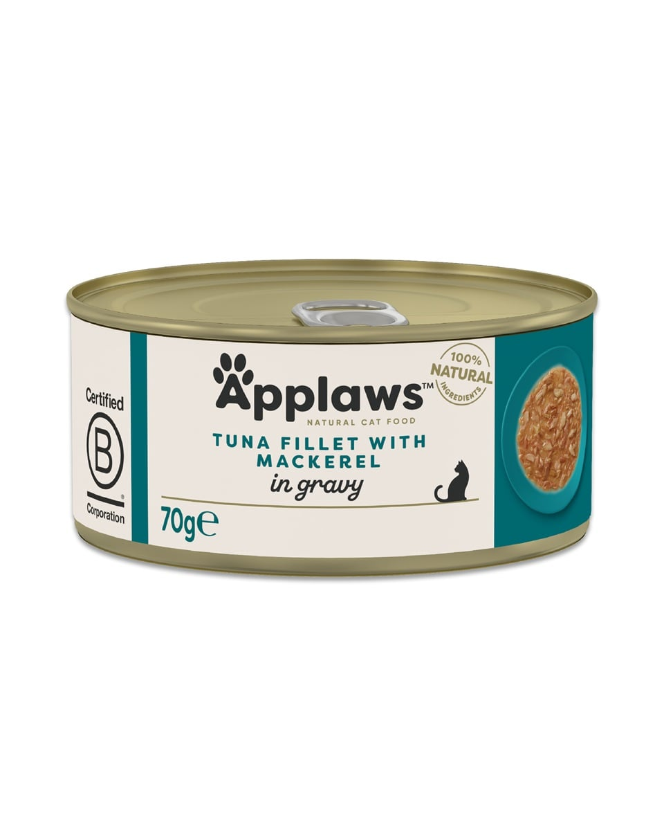 APPLAWS Cat Adult Tuna with Mackerel in Gravy este o hrană umedă complementară, naturală, destinată pisicilor adulte. Rețeta combină filet fin de ton cu macrou aromat, servite într-un sos ușor și apetisant, care crește palatabilitatea și contribuie la aportul de lichide.