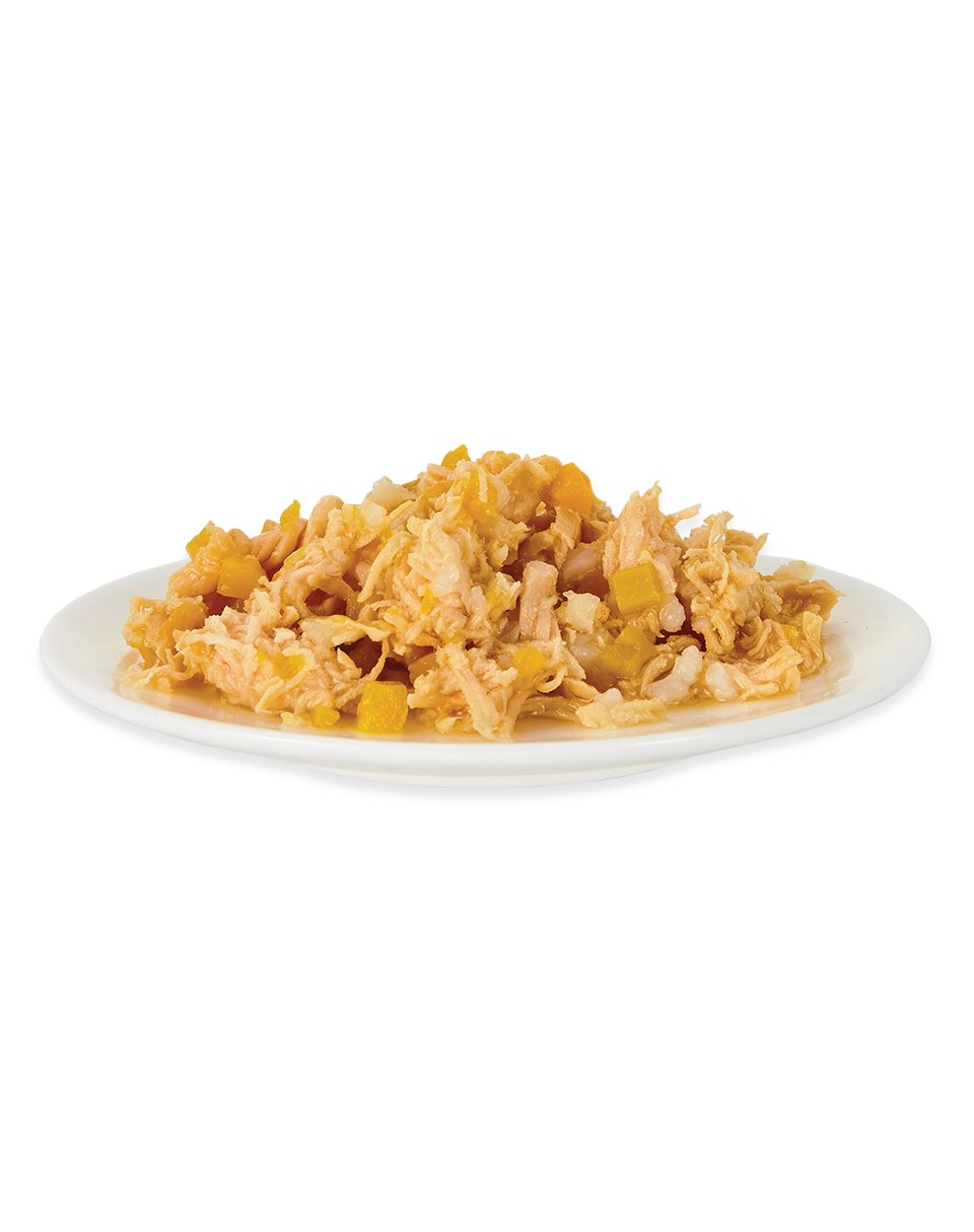 Piept de pui 50%, Bulion de pui 25%, Dovleac 24%, Orez 1%
