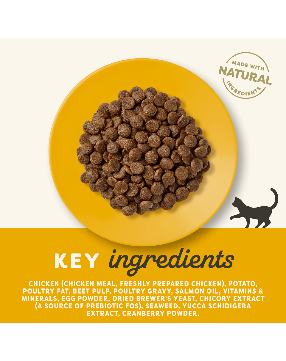 Compoziție: făină, carne uscată de pui 62%, carne de pui proaspăt tocată 17%, cartofi, drojdie, pulpă de sfeclă de zahăr, sos de pasăre 1% ulei de somon ca sursa de, EHA si DPA vitamine si minerale, oua, origine fibre de celuloză omega-3 plantă 0,03% clorură de sodiu, carbonat de calciu, alge marine, merișor, DL-metionină, clorură de potasiu, extract de yucca, extract de citrice, extract de rozmarin.