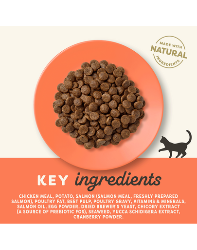 Carne de pui uscată, somon uscat, cartofi uscați, grăsime de pasăre, sos de pasăre, pulpă de sfeclă, ouă uscate (proteine și gălbenuș), ulei de somon, drojdie de bere uscată, fibre vegetale, extract de afine, extract de iaurt, extract de citrice , extract de ulei de rozmarin.