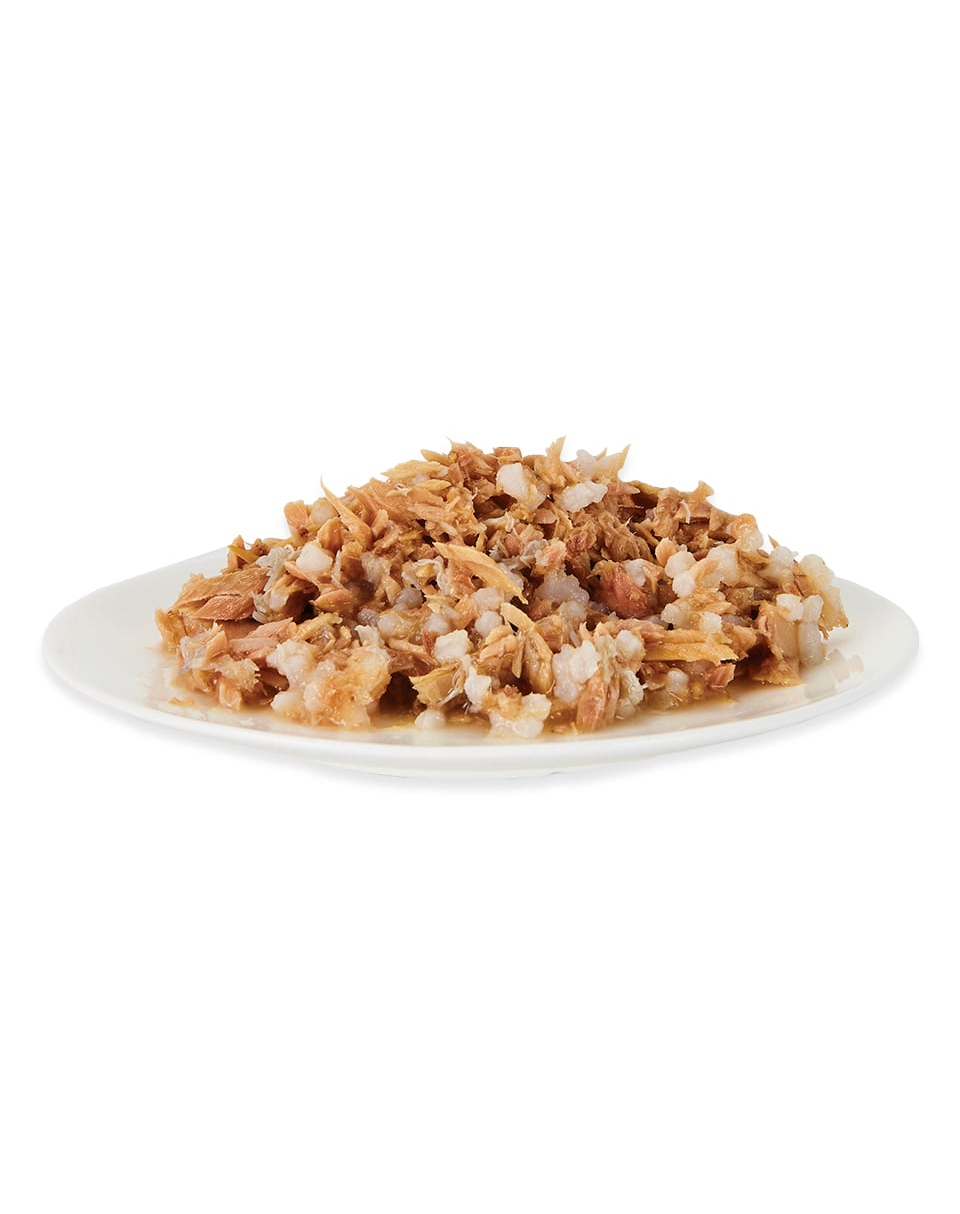 Bucăți de ton, separate în fileuri, sunt scufundate în bulion de pește. Se adaugă crab 5% și orez. Hrana conține carne pură, fără adaos de produse de origine animală sau MSM, oferind astfel pisicii dumneavoastră proteine de cea mai bună calitate.