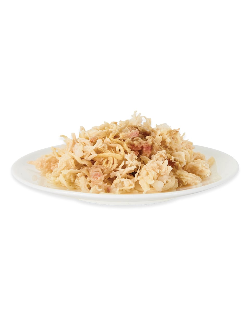 Piept de pui 70%, Rață 5%, Orez 1%, sos de pui 24%. Fără aditivi