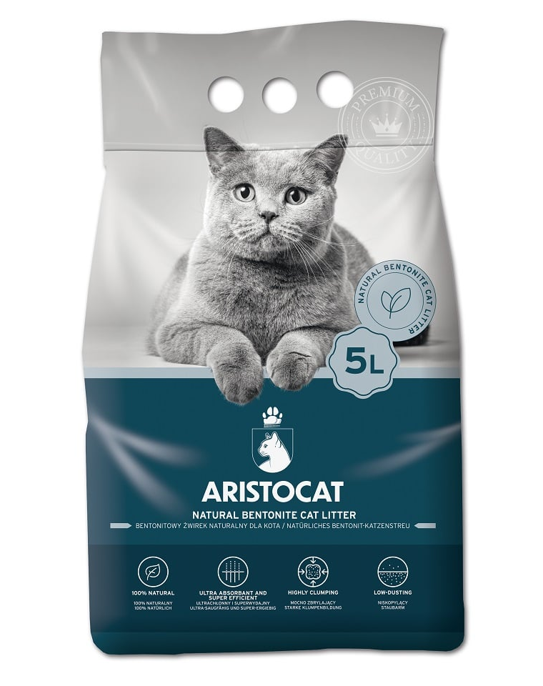 Așternutul este fabricat din bentonită, așa-numita argilă bentonită, care se găsește în mod natural în natură. Așternutul din bentonită are o acumulare redusă de praf, iar dimensiunea granulelor sale reduce dispersia particulelor în afara litierei. Formula pentru litieră asigură o performanță excelentă și o absorbție rapidă a umezelii și a mirosurilor. Așternutul se adună în bucăți ferme pentru a fi ușor de îndepărtat din cutia de gunoi.