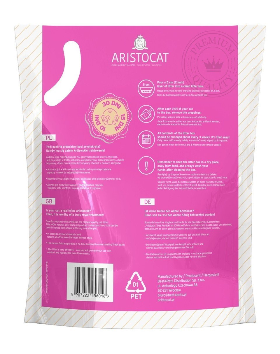 ARISTOCAT a fost creat pentru cele mai exigente pisici - se distinge prin absorbția rapidă a lichidelor și a mirosurilor neplăcute. Nu conține praf și nu se atașează lăbuțelor pisicilor - astfel încât casa va fi curată, iar pisica va fi fericită să folosească litiera.