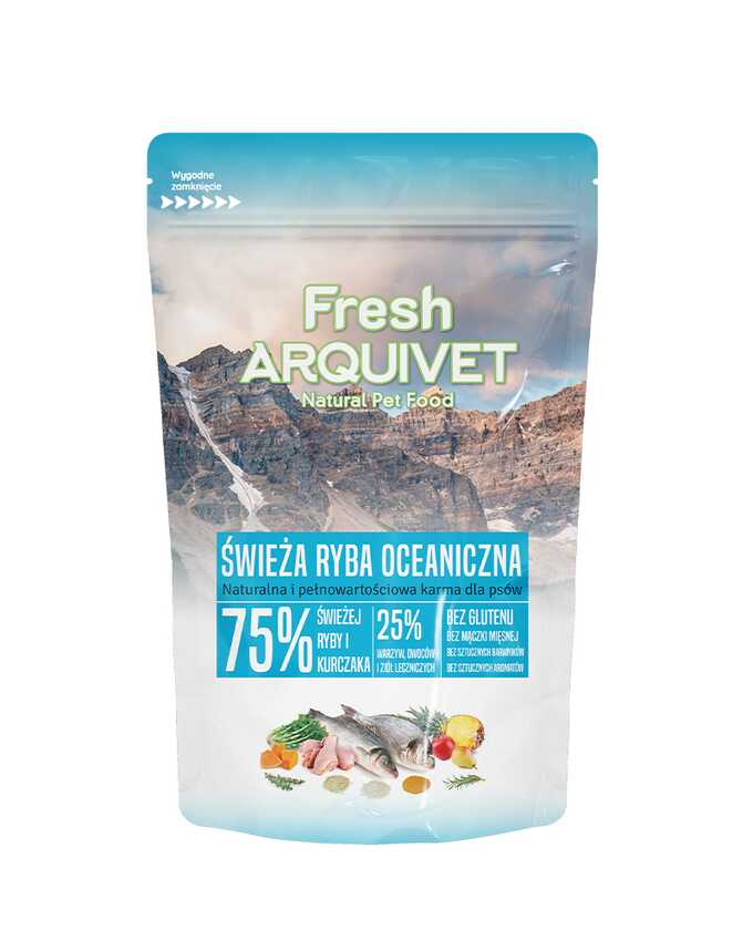 Arquivet Fresh Pește Oceanic este o hrană semi-umedă completă, destinată câinilor adulți de toate rasele. Formula sa echilibrată combină 55% pește proaspăt, 20% carne de pui și 25% legume, fructe și plante medicinale, oferind o alimentație naturală, gustoasă și ușor digerabilă.
