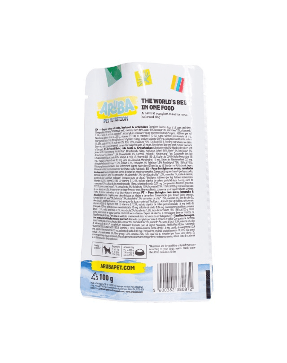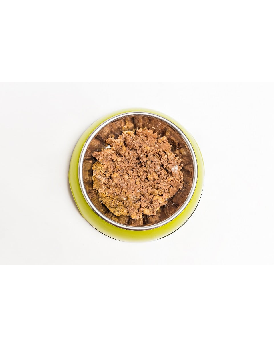 Ingrediente: curcan proaspăt* (carne proaspătă de piept, gât, carcasă, ficat) 86%, ovăz* 5%, sfeclă roșie* 3%, anghinare* 2%, semințe de chia* 1,5%, minerale 1%, ulei de somon, ulei de cocos*, Ascophyllum nodosum* (extract pur de alge marine) *ecologic.