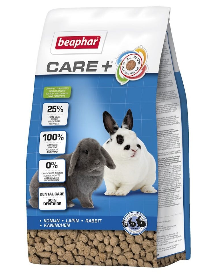 Care+ este o hrană uscată Super Premium perfect echilibrată, completă, perfect adaptată la cerințele nutriționale ale iepurilor. Este o hrană săracă în grăsimi, bogată în fibrele necesare pentru a asigura o digestie corectă. FOS și MOS acționează ca un prebiotic, protejând astfel intestinele. Conținutul de Omega 3 și Omega 6 are un efect benefic asupra inimii și a vaselor de sânge.