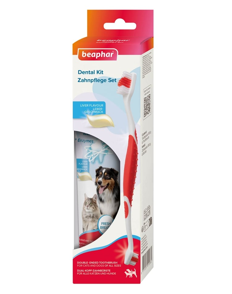 Asigură-i animalului tău o igienă orală perfectă cu BEAPHAR Dental Kit, setul complet care conține o periuță de dinți dublă și o pastă cu enzime, special concepute pentru câini și pisici.