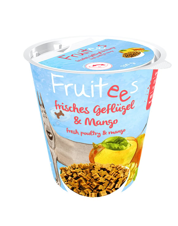 O gustare unică dedicată câinilor ca răsfăț-recompensă. Baza Fruitees este carnea de pasăre proaspătă, necongelată (20%) și adaosul de fructe. Produsul este foarte umed, deci este și mai moale față de bunătățile normale! Prin urmare, este recomandat și pentru toți câinii de talie mică. Fruitees sunt închise într-o cutie convenabilă cu un sistem de păstrare a prospețimii (deschidere și închidere multiple).