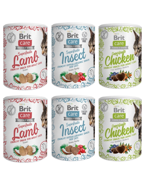 BRIT Care Snack Superfruits Mix este un set de gustări delicioase și sănătoase pentru pisici adulte, ce combină trei variante funcționale: pui, miel și insecte. Fiecare sortiment este bogat în ingrediente naturale, superfructe și proteine de înaltă calitate, oferind un plus de vitalitate, imunitate și bunăstare zilnică. Toate gustările sunt fără cereale, ușor digerabile și fără coloranți sau aditivi artificiali.