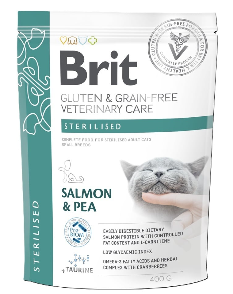 Brit Veterinary Care Cat Gluten & Grain Free Sterilised este o hrană dietetică completă pentru pisici adulte sterilizate. Formula fără cereale, pe bază de somon și mazăre, a fost dezvoltată cu un număr limitat de ingrediente pentru a susține digestia, sănătatea tractului urinar și menținerea unei greutăți corporale optime. Combinația de proteine ușor digerabile, plante, probiotice și ingrediente care sprijină articulațiile face din această hrană o alegere excelentă pentru pisicile cu cerințe nutriționale ridicate.