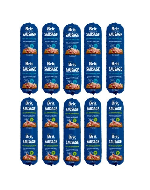 BRIT Premium Sausage Mix de arome (5x Chicken & Venison + 5x Chicken & Lamb) este o hrană completă, gustoasă și hrănitoare, concepută pentru câinii de orice rasă și vârstă. Textura moale, sub formă de pastă cu bucăți de carne în bulion, are un miros natural și irezistibil pentru câini.