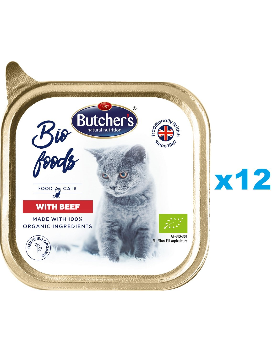 Butcher's Bio Foods este un aliment complet pentru pisicile adulte. Acesta a fost preparat din ingrediente ecologice, cultivat în mod responsabil într-un mediu natural, fără antibiotice și erbicide, ceea ce garantează cea mai înaltă calitate a acestora. Această rețetă oferă pisicii tale o dietă echilibrată și de înaltă calitate. Conține toate vitaminele și mineralele necesare de care are nevoie pisica ta.