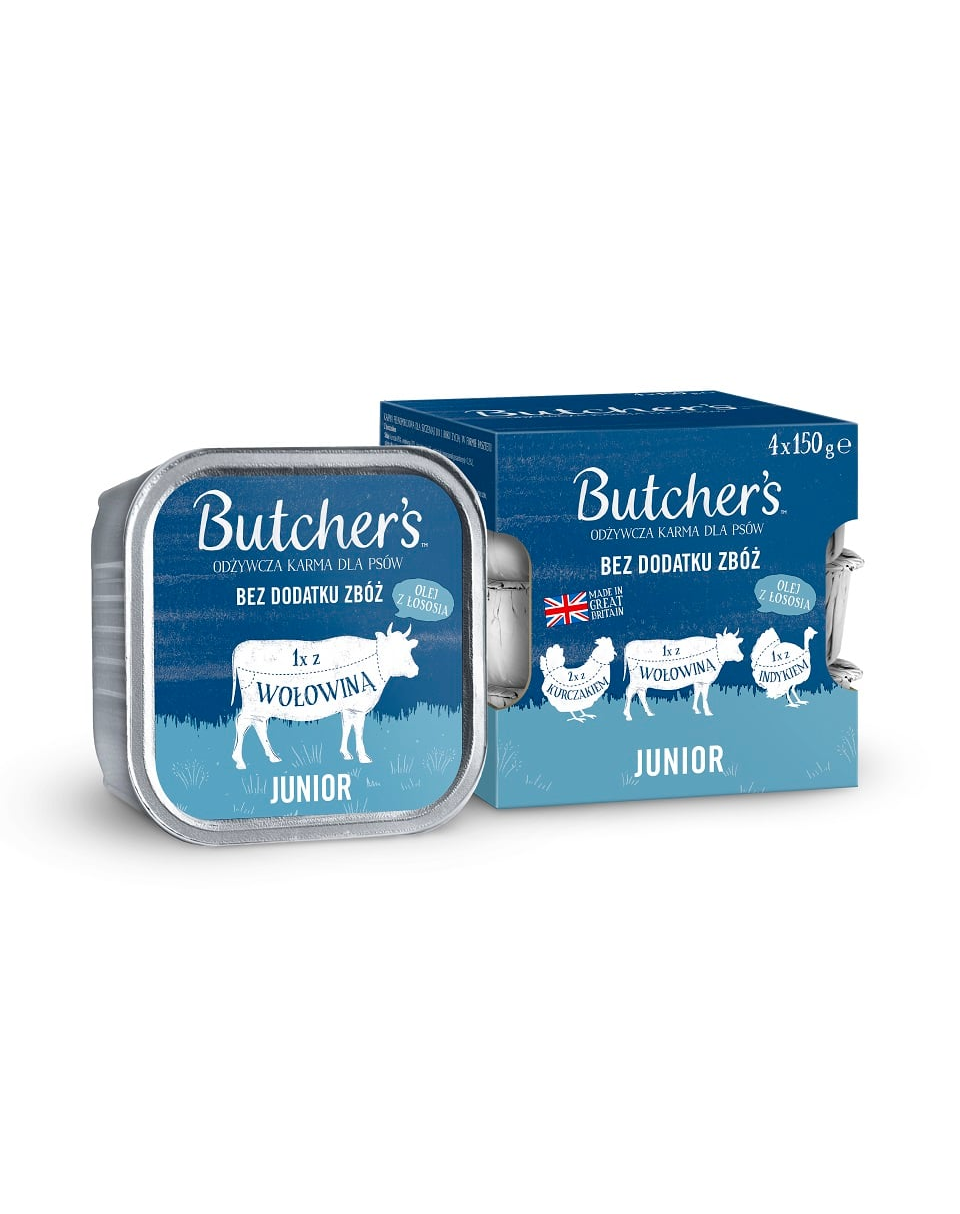 Butcher's Original Junior este o hrană fără gluten special formulată pentru nevoile nutriționale ale cățeilor. Ingredientele provin de la fermieri britanici și irlandezi locali, de încredere. Produsele din gamă sunt fără cereale și nu conțin umpluturi inutile, sare sau zahăr. Toate ambalajele sunt ecologice.