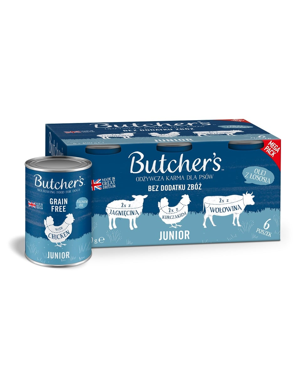 Butcher's Original Junior sunt alimente fără cereale dezvoltate ținând cont de nevoile nutriționale ale cățeilor. Produsele din această linie sunt concepute pentru a oferi cățeilor cel mai bun start în viața lor de adulți. Toate produsele se bazează pe ingrediente naturale și vin în ambalaje ecologice