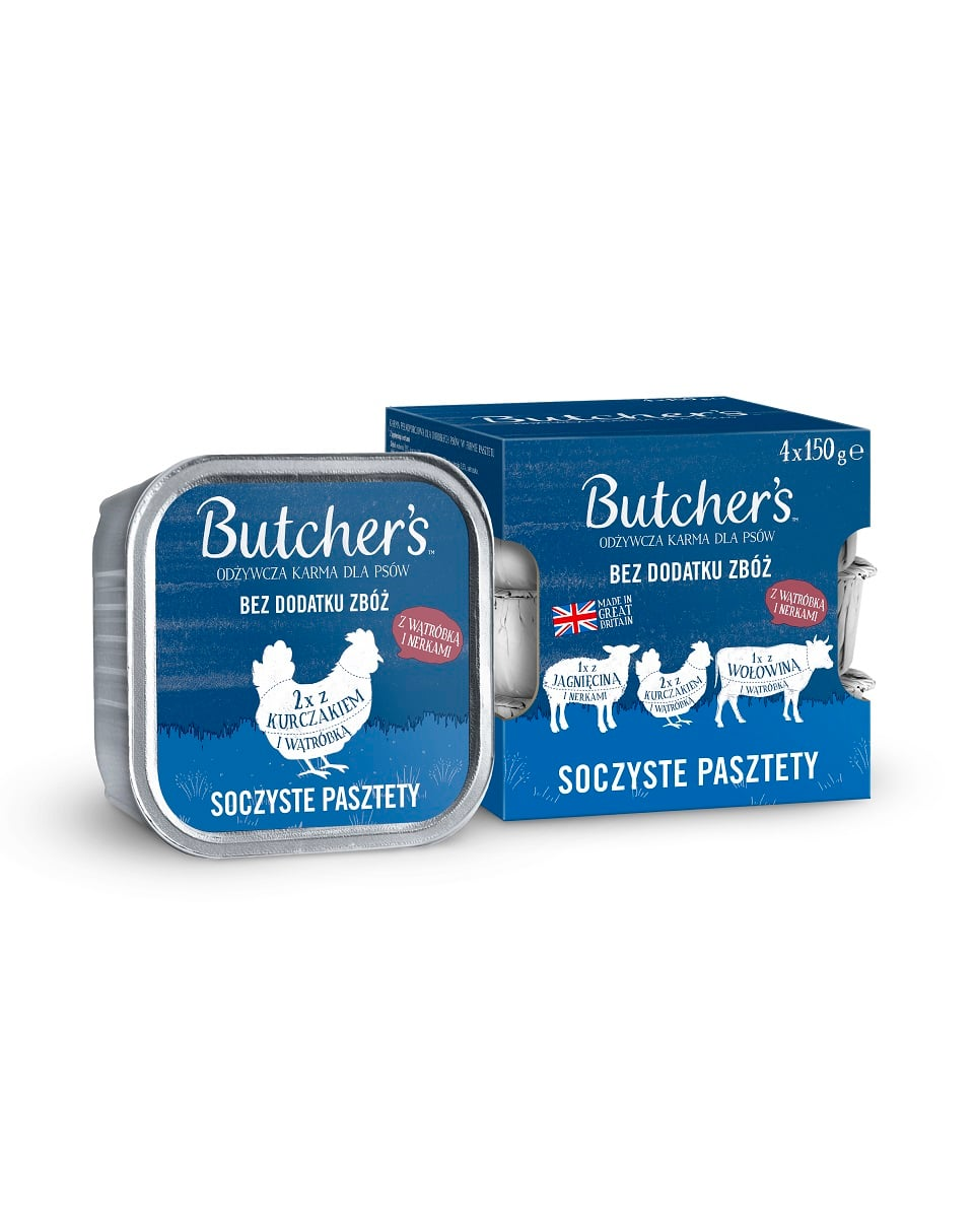 BUTCHER'S Original Juicy Pate este o hrană completă pentru câini sub forma unui pate delicat. În pachet veți găsi 3 variante delicioase de arome: 1x cu vită și ficat, 1x cu miel și rinichi, 2x cu pui și ficat. Această rețetă unică conține măceșe, mentă și cicoare pentru a oferi câinelui tău toți nutrienții de care are nevoie. Produsul este fără cereale și conține numai carne proaspătă de la furnizori de încredere și arome naturale.