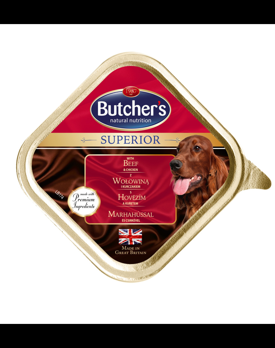 Butcher's Superior este o hrană umedă completă premium pentru câini, preparată din carne de calitate superioară, atent selectată. Carnea proaspătă și ingredientele unice oferă un gust rafinat, pe care câinele tău îl va iubi! Alege calitatea și gustul unic Butcher's!