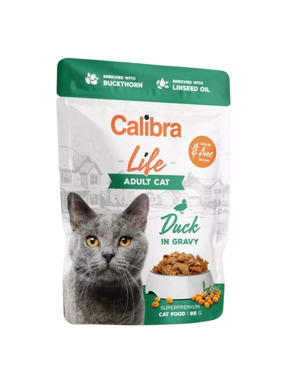 CALIBRA Cat Life Adult în sos cu rață este o hrană umedă premium pentru pisici adulte, formulată fără cereale, concepută pentru o alimentație zilnică echilibrată și gustoasă. Rețeta tip gulas conține 88% carne și produse de origine animală, fiind ușor digerabilă și foarte bine acceptată de pisici.