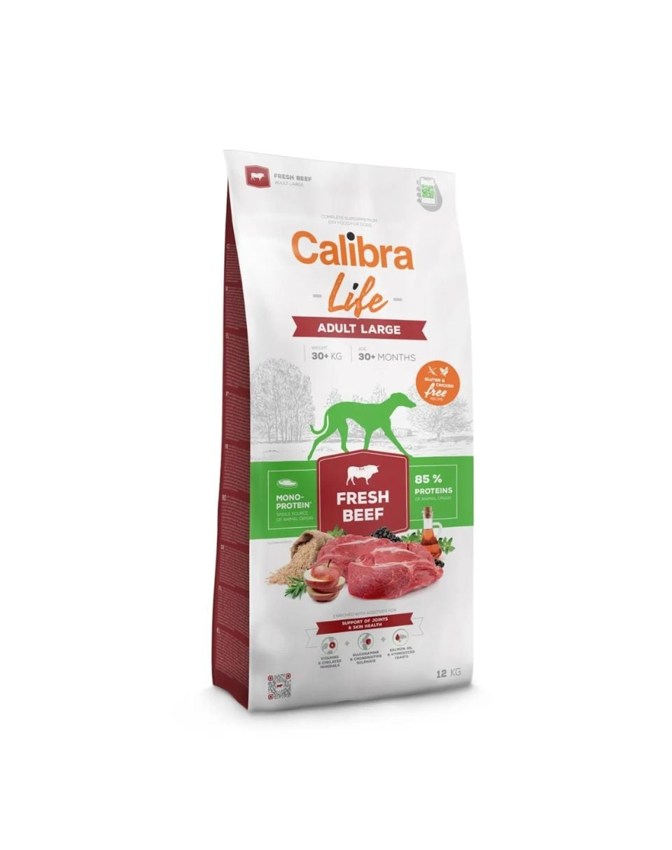 Hrană monoproteică pentru câini de talie mare. Calibra Dog Life Adult Large Fresh Beef este o hrană completă, ușor digerabilă, destinată câinilor adulți de talie mare (peste 30 kg), bazată exclusiv pe proteină de vită, inclusiv carne proaspătă. Formula este fără grâu și gluten, fără pui și fără adaosuri inutile, fiind potrivită și pentru câinii cu sistem digestiv sensibil.