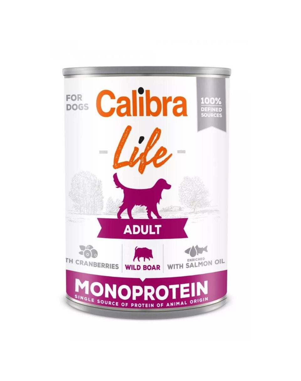 Calibra Dog Life Adult Boar Cranberry - o hrană umedă completă pentru câini adulți care conține mistreț și afine. Formulele cu o singură proteină constau dintr-un număr limitat de ingrediente. Fără cereale și gluten pentru o digestibilitate excelentă a hranei. Conține 100% din ingredientele specificate.