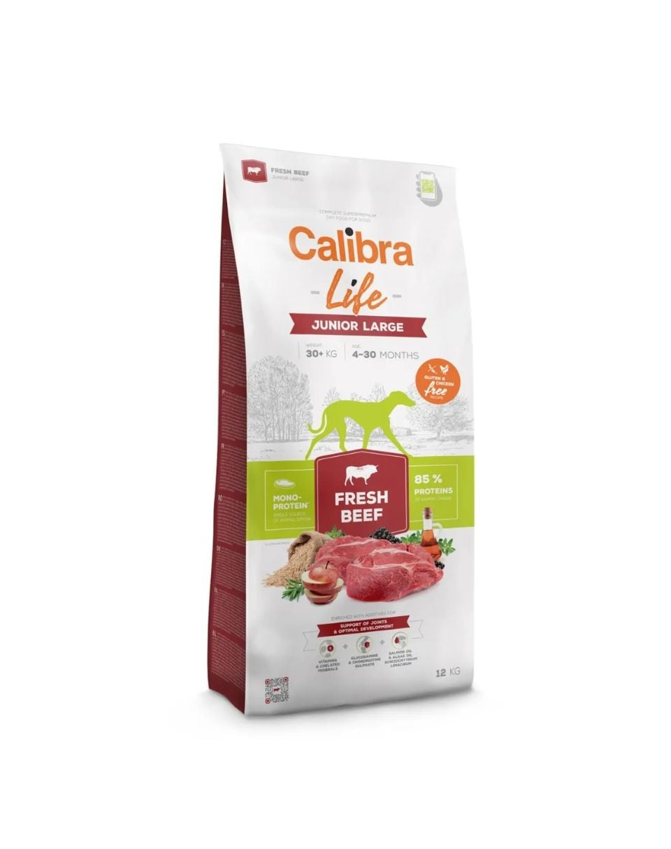 CALIBRA Dog Life Junior Large Fresh Beef este o hrană completă, 100% monoproteică, pe bază exclusivă de vită – fără adaos de pui. Rețeta este special formulată pentru câini tineri de talie mare (peste 30 kg la maturitate), cu vârsta între 4 și 30 de luni, perioadă caracterizată prin creștere rapidă și nevoi nutriționale specifice.
