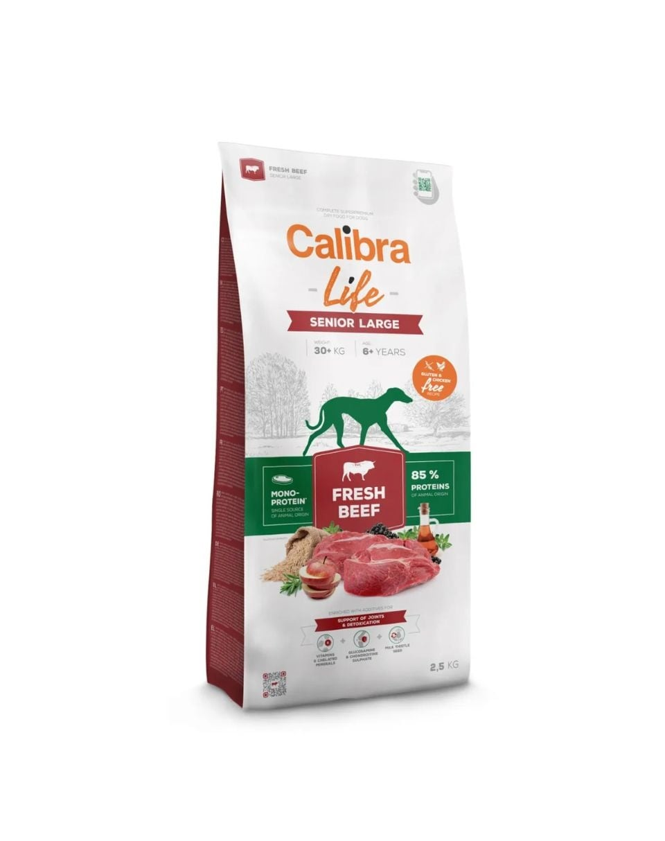 Hrană monoproteică pentru câini seniori de talie mare. Calibra Dog Life Senior Large Fresh Beef este o hrană uscată completă superpremium, creată special pentru câinii seniori (6+) de talie mare, cu greutatea de peste 30 kg. Rețeta este bazată exclusiv pe vită, inclusiv carne proaspătă, combinată cu orez, asigurând o digestibilitate ridicată și o toleranță bună, fiind potrivită și pentru câinii cu sistem digestiv sensibil.