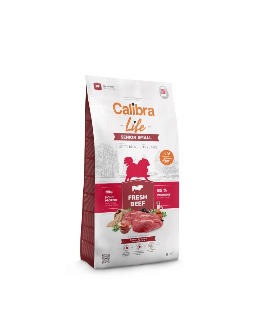 Calibra Dog Life Senior Small Fresh Beef este o hrană uscată completă superpremium destinată câinilor vârstnici de talie mică (7+ ani, 1–10 kg). Formula monoproteică, bazată exclusiv pe carne de vită, inclusiv carne proaspătă, combinată cu orez, asigură o digestibilitate ridicată și delicatețe, fiind ideală și pentru câinii cu sistem digestiv sensibil.