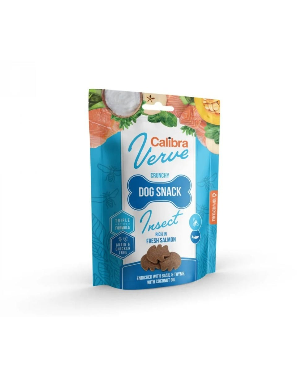 Chiar crocante și aromate, gustările Calibra Dog Verve sunt o recompensă sănătoasă pentru câinele tău! Rețeta bazată pe proteina din insecte și somon proaspăt este ușor digerabilă, bogată în nutrienți și ideală chiar și pentru câinii cu sistem digestiv sensibil.