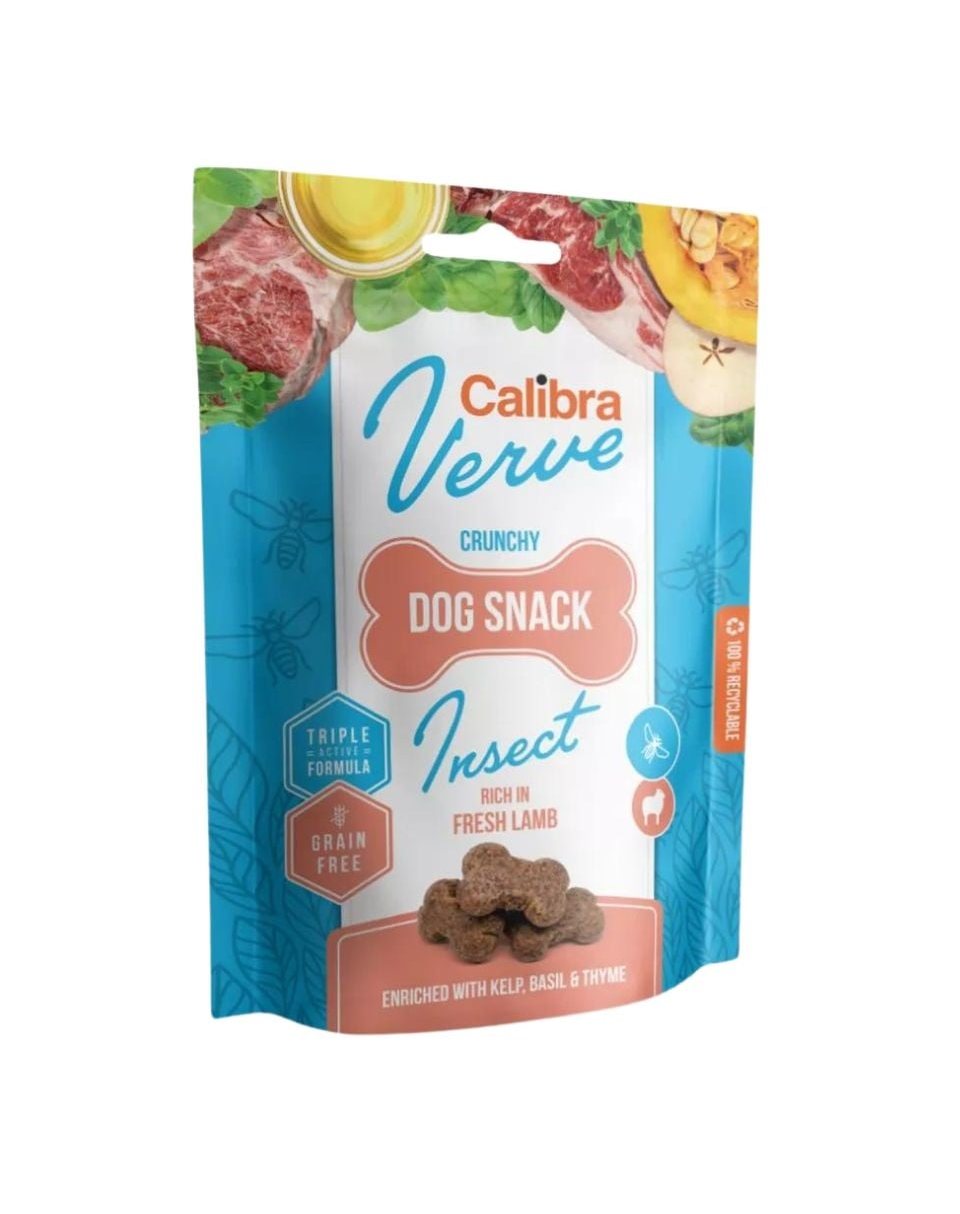 Calibra Dog Verve Crunchy Snack Insect&Fresh Lamb este o recompensă crocantă și fără cereale cu proteine de insecte și miel proaspăt.